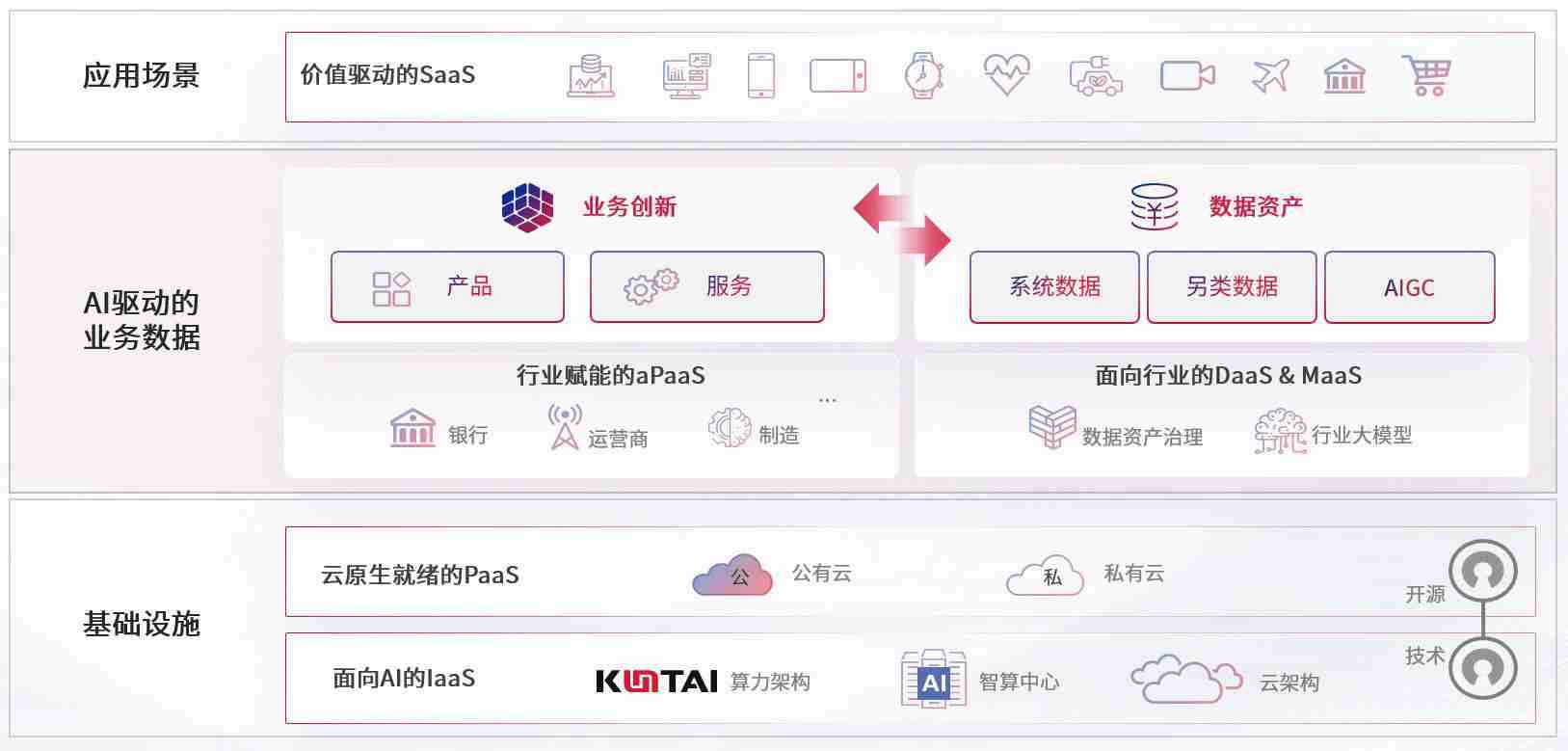 数字时代,,围绕企业数字化转型的关键要素,,9B娱乐数码开创性的提出数云融合战略和技术体系框架,,着力在云原生、、数字原生、、、AI原生和信创产业上架构产品和服务能力,,,,为处在不同数字化转型阶段的快消零售、、、、汽车、、金融、、医疗、、、、政企、、、教育、、、运营商等行业客户提供泛在的敏捷IT能力和融合的数据驱动能力,,,构建跨界融合创新的数字业务场景和新业务模式,,助力企业级客户建立面向未来的核心能力和竞争优势,,全面推动社会的数字化、、、、智能化转型升级。。