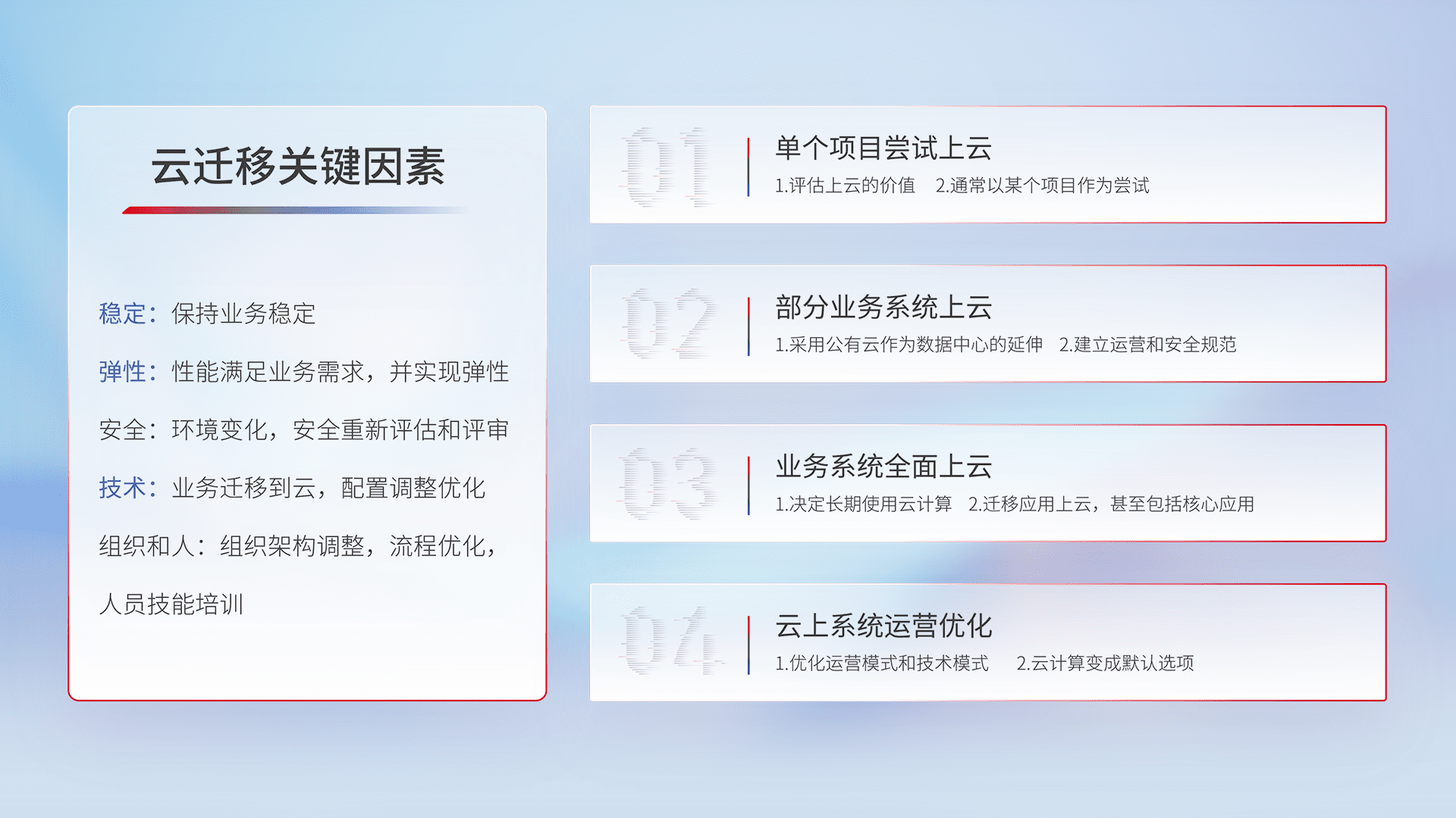 结合实际业务,,从规划设计、、、云平台选型、、云原生改造、、数据迁移、、、集成交付,,迁移全过程为客户识别最佳上云路径,,,做好风险识别管理,,,设计网络架构、、、身份权限、、安全审计合规、、、、操作审计、、、、日志审计、、监控告警策略、、、多站点容灾设计等,,,对云上基础设施进行整体规划,,,提升IT治理水平,,,以满足弹性、、、、高可用、、高性能的需求。。。