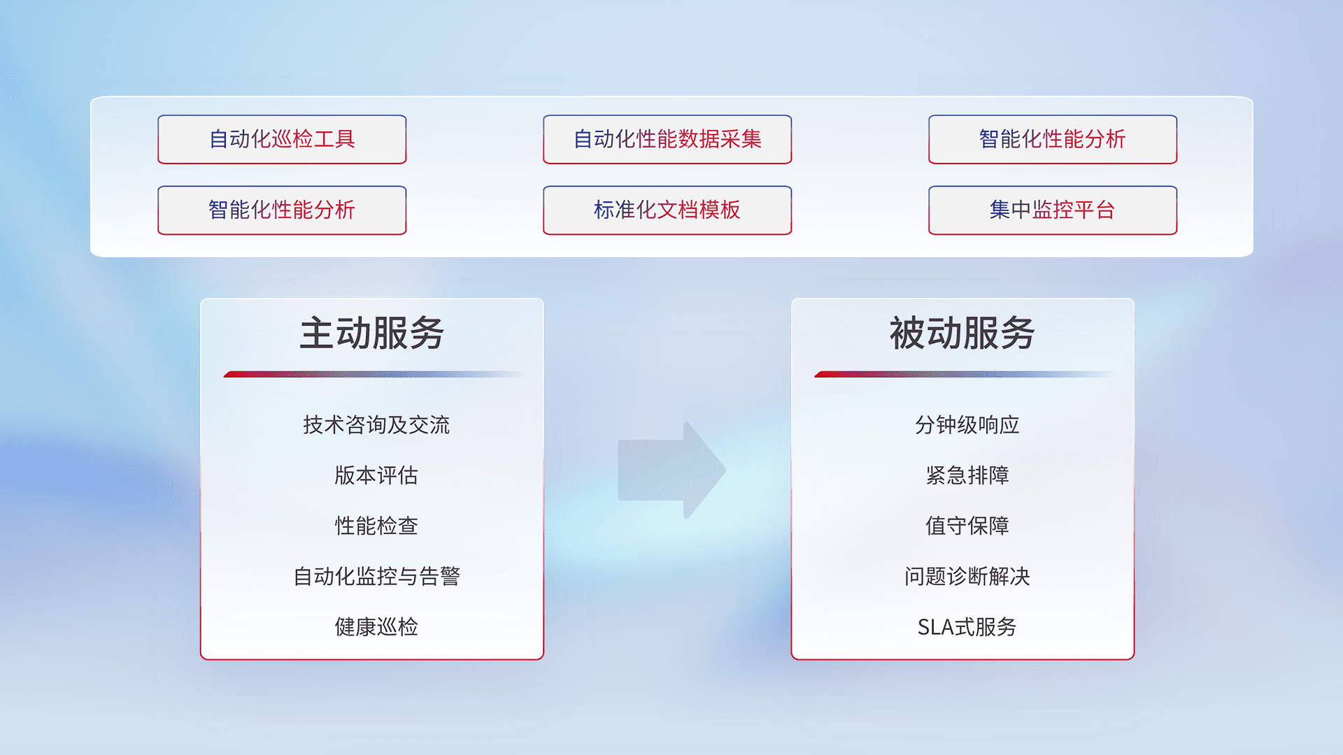 智能化工具和标准化文档,,,保障服务质量,,提供主动服务(包含技术咨询、、版本评估、、、、性能检查、、自动化监控与告警、、健康巡检)和被动服务包含(分钟级响应、、紧急排障、、、、值守保障、、、、问题诊断解决、、、、SLA服务)。。。